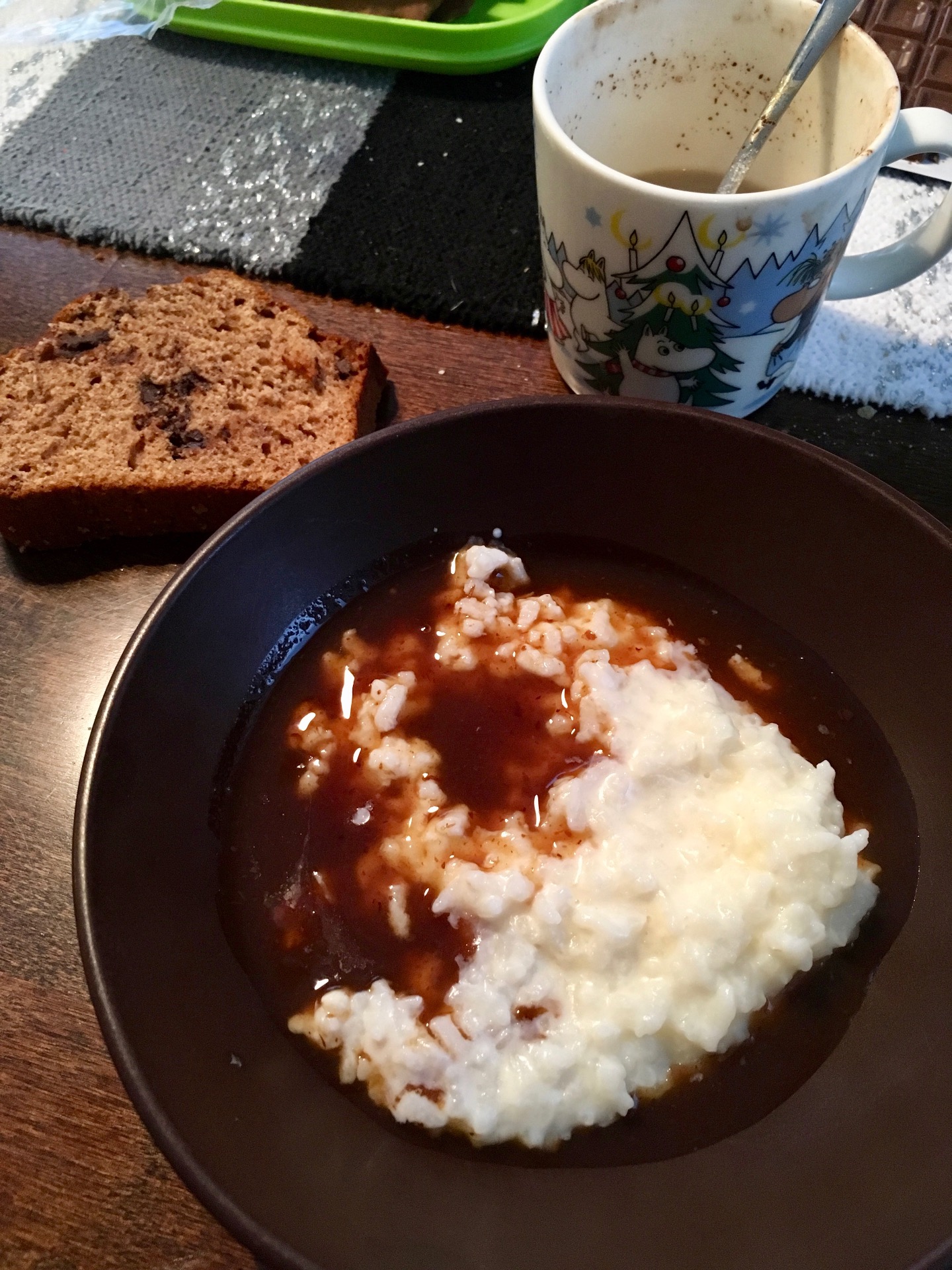 - Le jour du 24 commence par un porridge de Noël, généralement en famille. Il s'agit d'un porridge de riz au lait cuit à la casserole pendant 30 à 45 minutes. Accompagné d'une soupe de raisins aux épices et d'un café de noël (à la cardamum et à la cannelle), il est coutume de regarder un dessin animé, "Les contes de noël" de Disney sous un plaid, au chaud. S'en suit généralement le traditionnel sauna.
